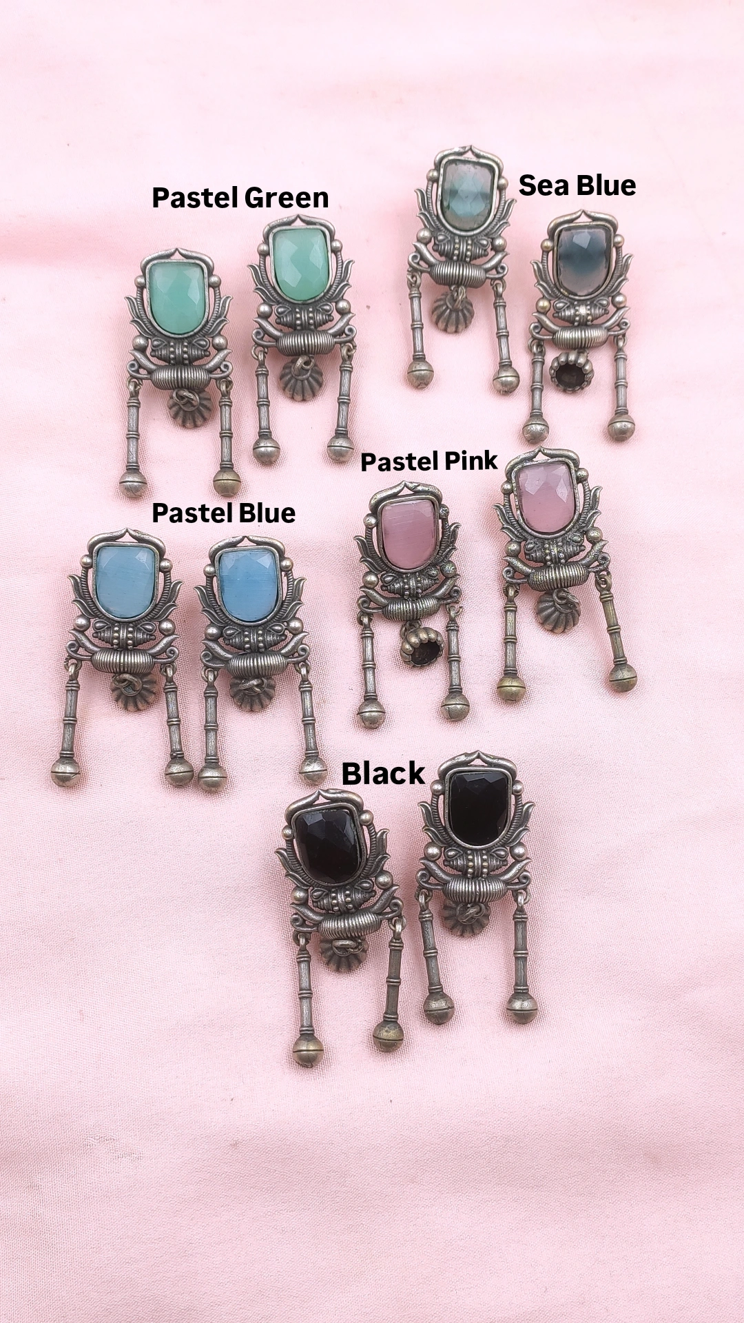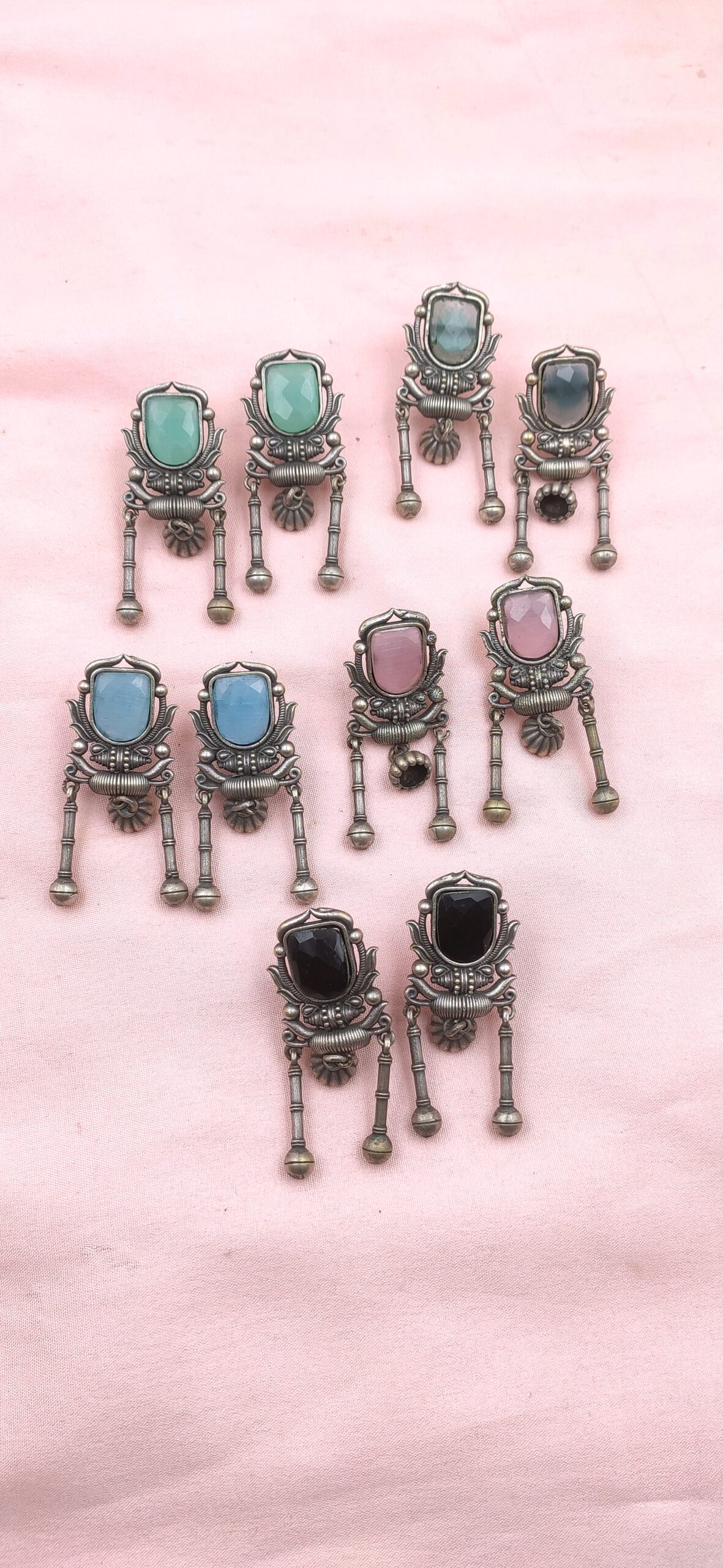 The design begins with a unique, shield-shaped top piece, which is intricately detailed with traditional patterns and a rope-like border. The centerpiece of this section is a beautiful, smooth, original glass-cut monalisa stone. The stones have a polished finish that catches the light beautifully and are available in a variety of vibrant colors, including sea green, grey, baby pink, light blue, and black. This beautiful contrast against the dark metalwork makes each pair a unique statement piece.
