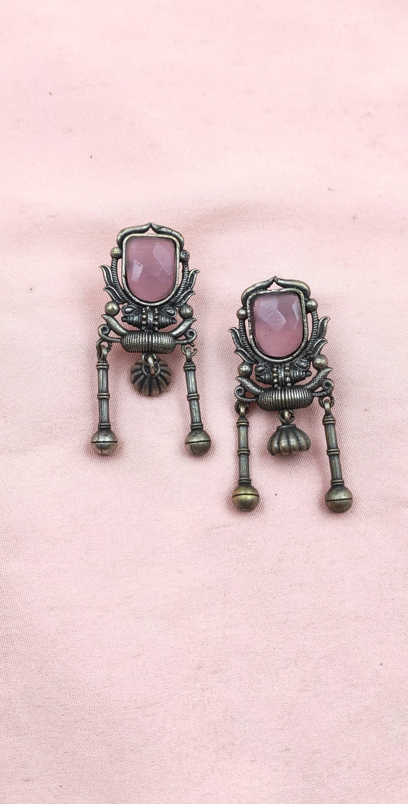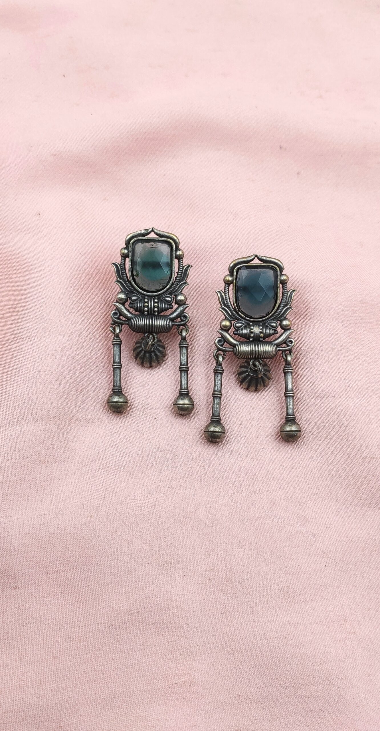 These striking oxidised silver look-alike earrings are a perfect blend of rustic charm and elegant design. Crafted from oxidised brass, each pair features a vintage-inspired shield shape adorned with a smooth, original glass-cut monalisa stone. A delicate, chain-like bottom with ghungroo beads hangs below, making them a unique and elegant accessory for any occasion.