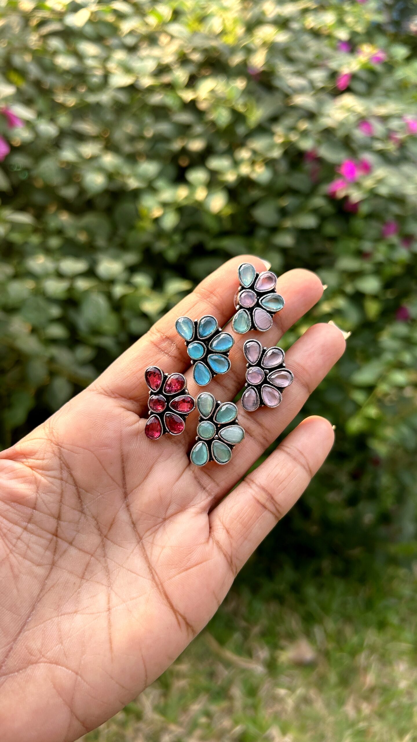 Discover the delicate beauty of these monalisa stone flower stud earrings, a perfect blend of classic elegance and modern design. Each pair is meticulously crafted from high-quality brass and finished with a rich oxidised coating, giving them an antique, rustic charm.