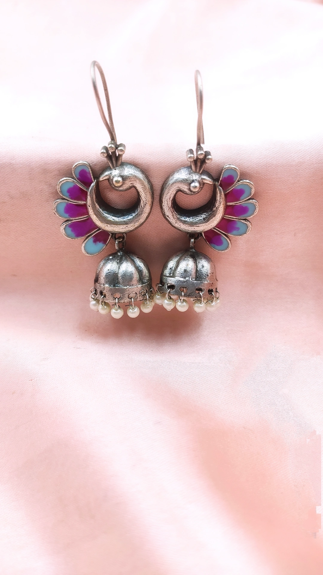 Attached to the peacock stud is a classic dome-shaped jhumka, featuring delicate carvings and a fringe of tiny pearl drops. These pearls add a hint of elegance and subtle movement, completing the traditional aesthetic. The earrings are lightweight and comfortable for prolonged wear, with a secure hook closure for ease of use.